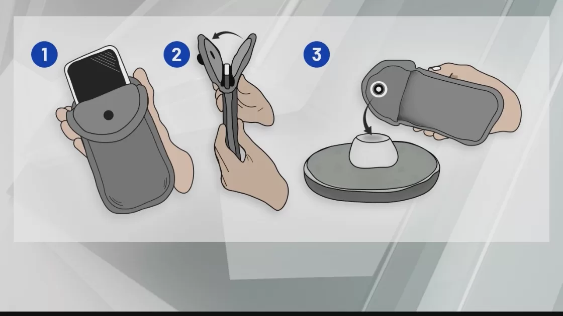 - Ievietošana: Lietotājs ievieto savu telefonu Pouch maciņā;